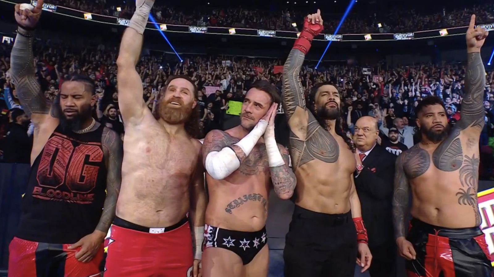 Roman Reigns beat Solo Sikoa after multiple consecutive finishers at WWE Survivor Series, winning the WarGames main event alongside CM Punk & the OG Bloodline.